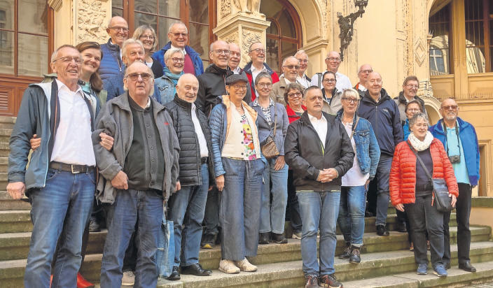 Die gut gelaunten Teilnehmer der Chorreis e im Innenhof de s Sc hwe rin er Schlosses. Fotos: fh/Harmonie