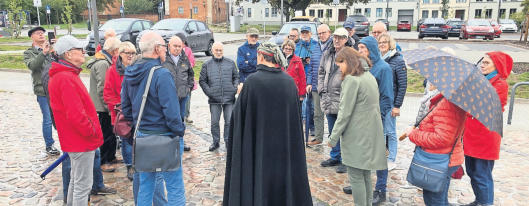 Diese f ührte die rund 30-köpfige Rei - segruppe am ersten Tag nac h ei nem kuzren Zwischens topp für ei n - zweites Fr ühs ck im schleswig- holstein i che R ei nfeld in d i e Ha nse - stad t Wi smar. Dort stand zunächst bei nich t ganz optimalen, meteorologi - s c h e n B e d i n g u n g e n e i n e g r o ß e Hafenrundfahtr auf dem Pr o - g r a m m . B e i e i n e m K a f f e e g e s c h ü t z t u n t e r D e c k k o n n t e n d i e S ä n g e r d a n n l e r n e n , d a s s W i s m a r a u ch heute noc h, g anz i m Sinne der - einstigen Han se, i m Ostseeve rkehr - mit den a nd ere n Anrainerstaaten ei n w ich ti ge r Umschl agpunkt f ür - H o l z , R e c y c - l i n g , D ü n g e m i t t e l o d e r e r n e u e r b a r e n En erg ie n ist. I m A n s c h l u s s a n d i e H a f e n r u n d d ah rt bo t sic h dann f ür d ie Teilnehm er de r Cho rr ei sed ie Möglichkeit, einen r echtbe r ühmten Sohn der Sta dt k e n n e n z u l e r n e n : K l a u s S t ö r t e b e k e r , d e r n a c h h i s t o r i s c h e n A u f z e i c h n u n - gen 1381 in W ismar ge lebt haben soll. Kein Wunder, das s der ein sti ge Pirat di e Sän ger zu einem Stadtrund- ga ng ei nlud und dabei vi el Hi stor isches zu der Stadt an de r W ismare r